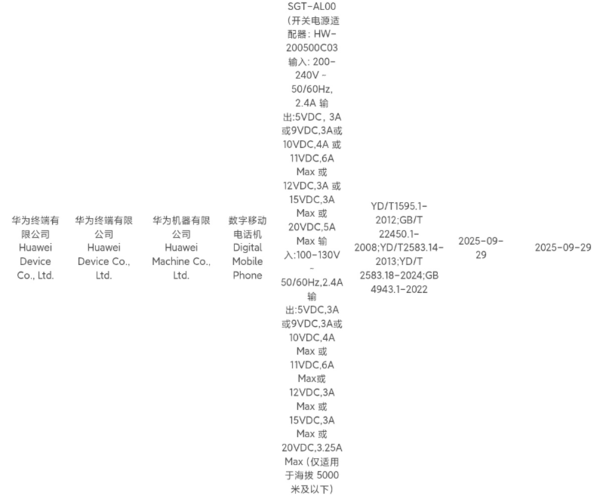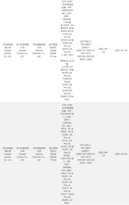 【CNMO科技消息】9月30日,有数码博主称,华为三款型号为VYG-AL00、SGT-AL00和SGT-AL50的新机已正式入网。曝光的信息显示,型号为VYG-AL00的机型支持66W有线充电,型号为SGT-AL00和SGT-AL50的新机支持100W有线快充。根据网友猜测,这三款机型分别是华为nova 15以及Mate 80系列。